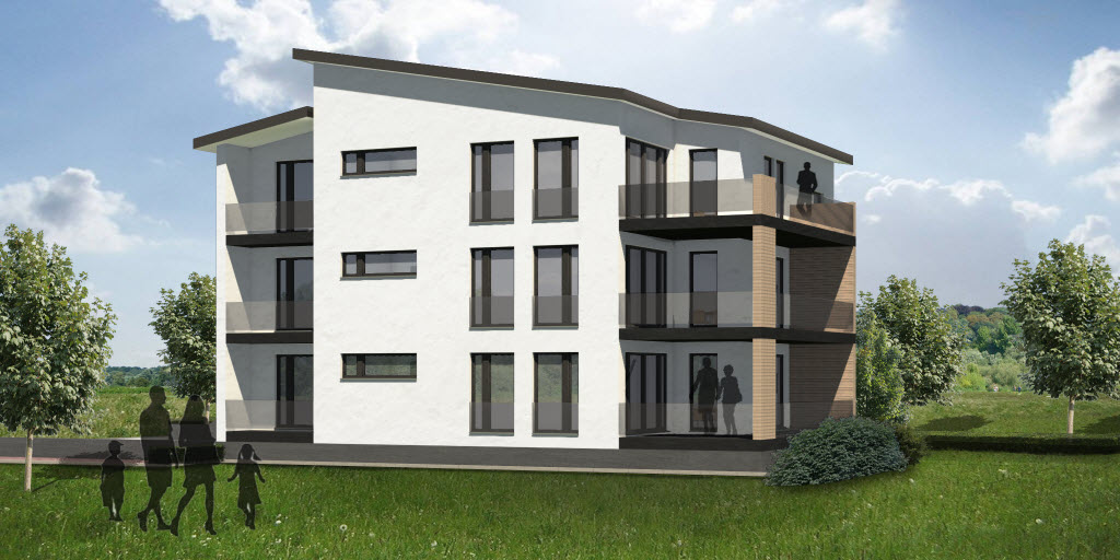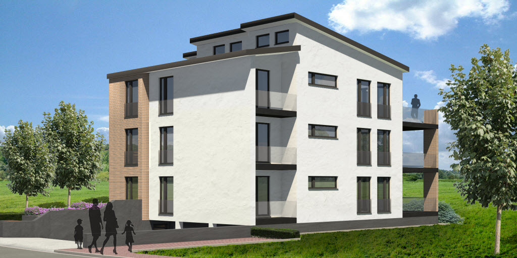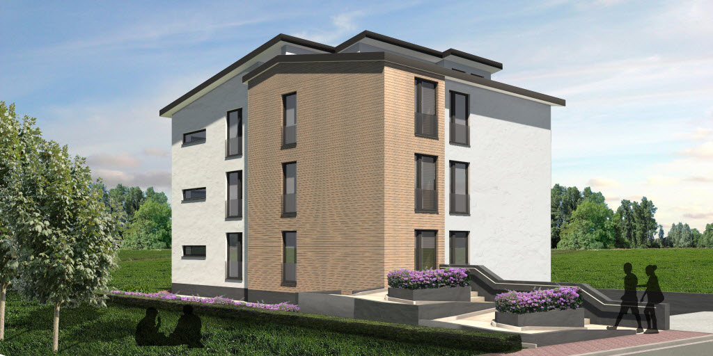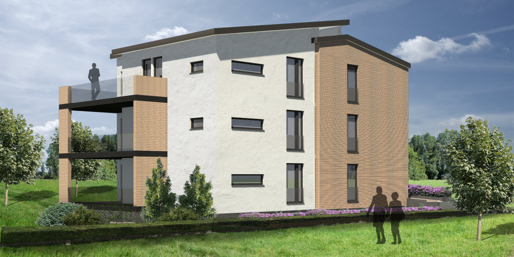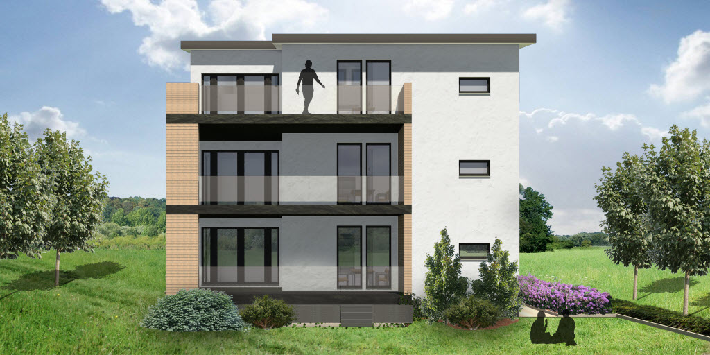 In diesem Gebäude finden sich 3 Eigentumswohnungen die mit jeweils 3 Schlafzimmern und 2 Balkonen ausgestattet sind. Das große Gebäude wird hierbei durch Vor- und Rücksprünge und die Nutzung von unterschiedlichen Materialien optisch aufgelockert. Die Garagen befinden sich integriert im Kellergeschoss des Gebäudes, wo auch großzügige Kellerräume Platz finden. Dieses Haus ist so konzipiert, dass dort behindertengerechtes Wohnen möglich ist. Es gibt breite Gänge, einen Fahrstuhl und großzügige Räume. Die Erschließung im Außenbereich erfolgt über eine atmosphärisch gestaltete Rampe.